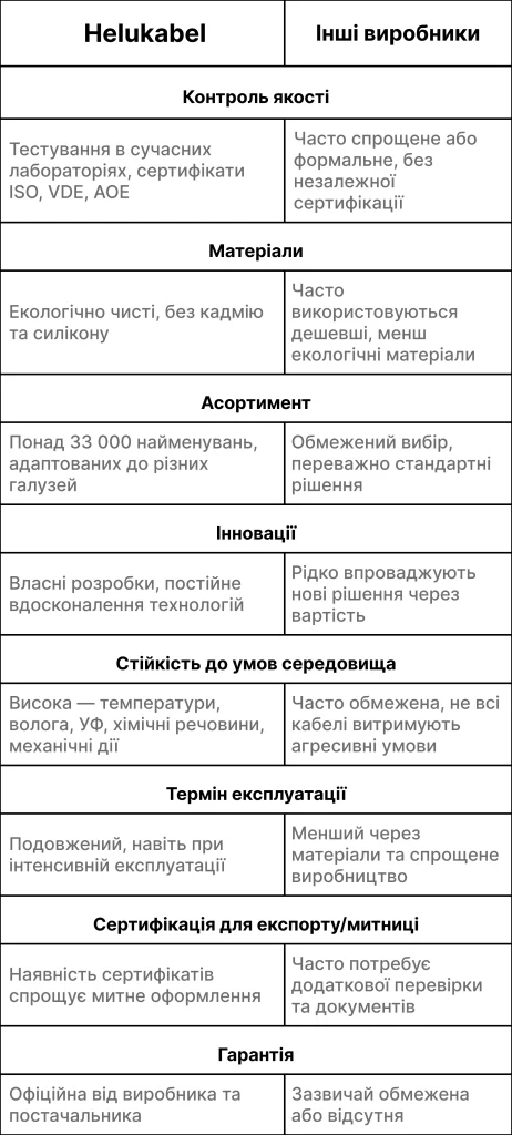 - оригінальні кабелі з ЄвропиЕлектроТехноПром є прямим постачальником продукції HELUKABEL, що дозволяє надавати нашим клієнтам безпосередній доступ до високоякісних кабельних рішень. Ми гарантуємо: