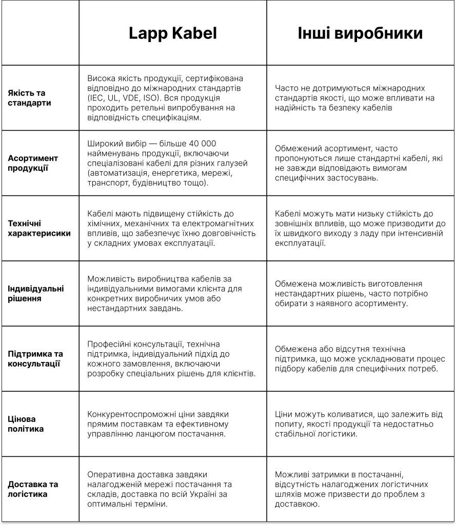 - лідер у виробництві кабельно-провідникової продукціїЕлектроТехноПром є прямим постачальником продукції Lapp Kabel, що дозволяє надавати нашим клієнтам безпосередній доступ до високоякісних кабельних рішень. Ми гарантуємо: